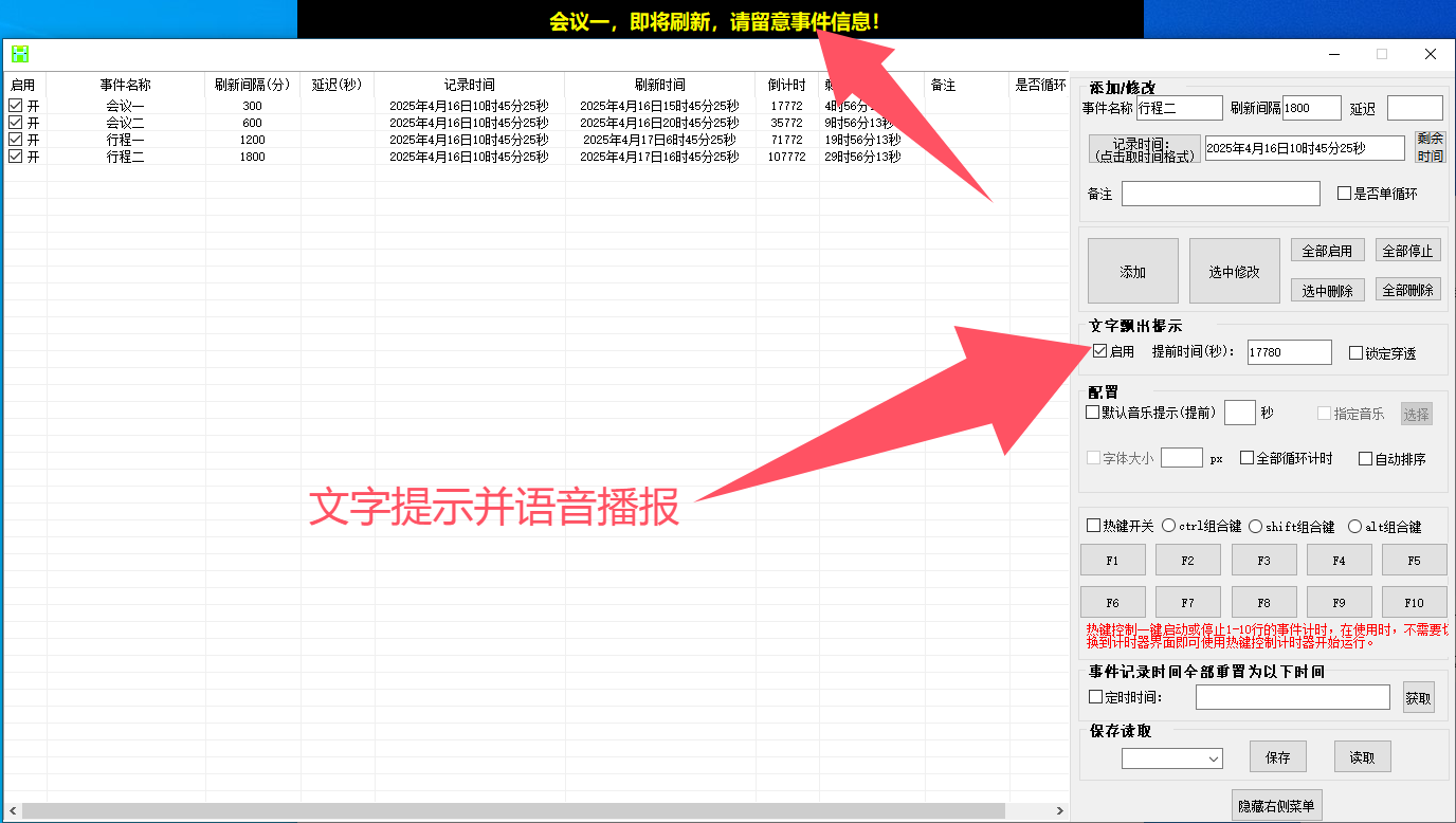 当某个事件到达设置的秒数后会自动弹出文字以及朗读该事件名称即将刷新。
