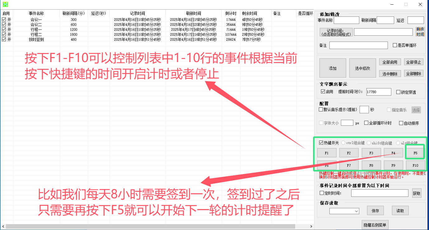 F1~F10可控制列表中1-10行的事件计时开关,配合自动排序功能,最快刷新的怪每次按f1即可。